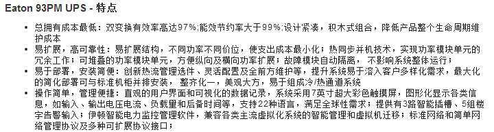 伊頓93PM系統(tǒng)提供了完整的機房整體基礎(chǔ)電力系統(tǒng)。系統(tǒng)包括了一個關(guān)鍵的核心機房的中所有供電的基礎(chǔ)設(shè)施:輸入/輸出饋線單元、輸入配電單元、可擴展功率模塊單元、維修隔離單元、儲能單元、監(jiān)控單元、輸出配電單元,如果需要,也可與伊頓的IT專用機柜、可編程型智能PDU組成完整的機房基礎(chǔ)架構(gòu),更可與伊頓的AMS/HRS熱流管理系統(tǒng)配套,通過市場領(lǐng)先的運營效率和世界級的智能化管理確保以最低的總擁有成本實現(xiàn)關(guān)鍵體系的持續(xù)運行。
