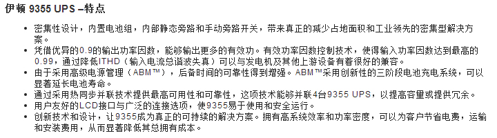 伊頓9355UPS 為IT和電力基礎(chǔ)設(shè)施及企業(yè),醫(yī)療,金融和工業(yè)的應(yīng)急系統(tǒng),提供雙轉(zhuǎn)換后備電力和可擴(kuò)展運(yùn)行時(shí)間電池組,最大運(yùn)行時(shí)間電池組也只需要極小的占用面積,使得9355 UPS成為真正意義上的三相電力保護(hù)專(zhuān)家。