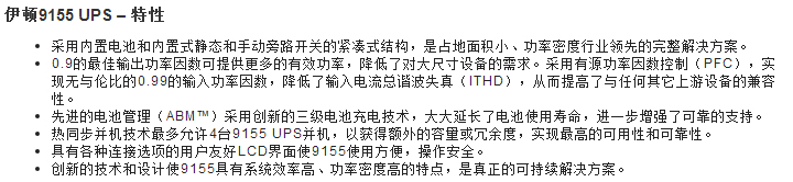 伊頓9155 UPS為公司企業(yè)、醫(yī)療機構(gòu)、銀行和工業(yè)應用場合中的IT和電氣工程基礎(chǔ)設(shè)施或其它關(guān)鍵系統(tǒng)提供優(yōu)質(zhì)雙轉(zhuǎn)換后備電源和可升級的運行時間。9155 UPS可以用很小的占地空間提供最大的電池運行時間,是真正的全三相電源保護解決方案。