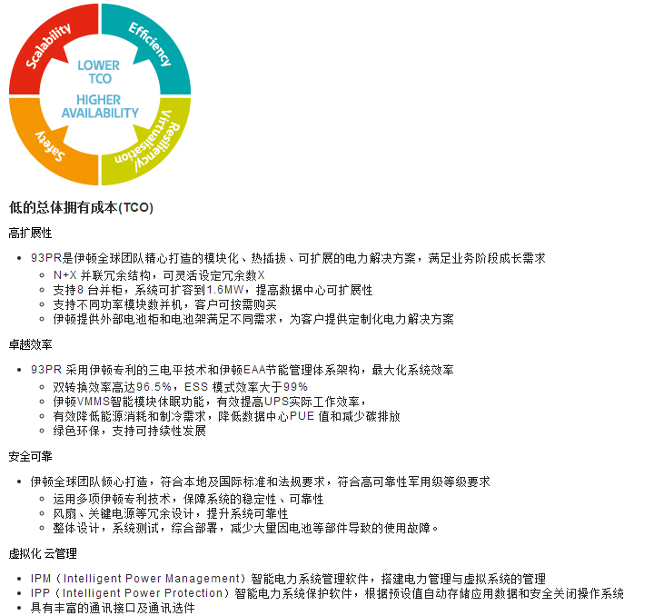 93PR模塊化UPS及關(guān)鍵電力保護(hù)系統(tǒng)采用當(dāng)今先進(jìn)的及伊頓專(zhuān)利的電力電子技術(shù),由伊頓全球團(tuán)隊(duì)傾心打造,符合高可靠性軍用等級(jí)要求,綜合設(shè)計(jì),系統(tǒng)測(cè)試和驗(yàn)證的系統(tǒng),減少大量因電池等部件導(dǎo)致的使用故障,確保客戶(hù)業(yè)務(wù)持續(xù)運(yùn)行。采用伊頓專(zhuān)利的三電平技術(shù),雙變化效率高達(dá)96.5%,交流直供模式下效率大于99%,有效降低客戶(hù)總體擁有成本(TCO)?梢匀鏉M足從網(wǎng)絡(luò)配線間、中小數(shù)據(jù)中心到大型數(shù)據(jù)中心的應(yīng)用及自動(dòng)化或醫(yī)療等應(yīng)用場(chǎng)所的電力保障要求。